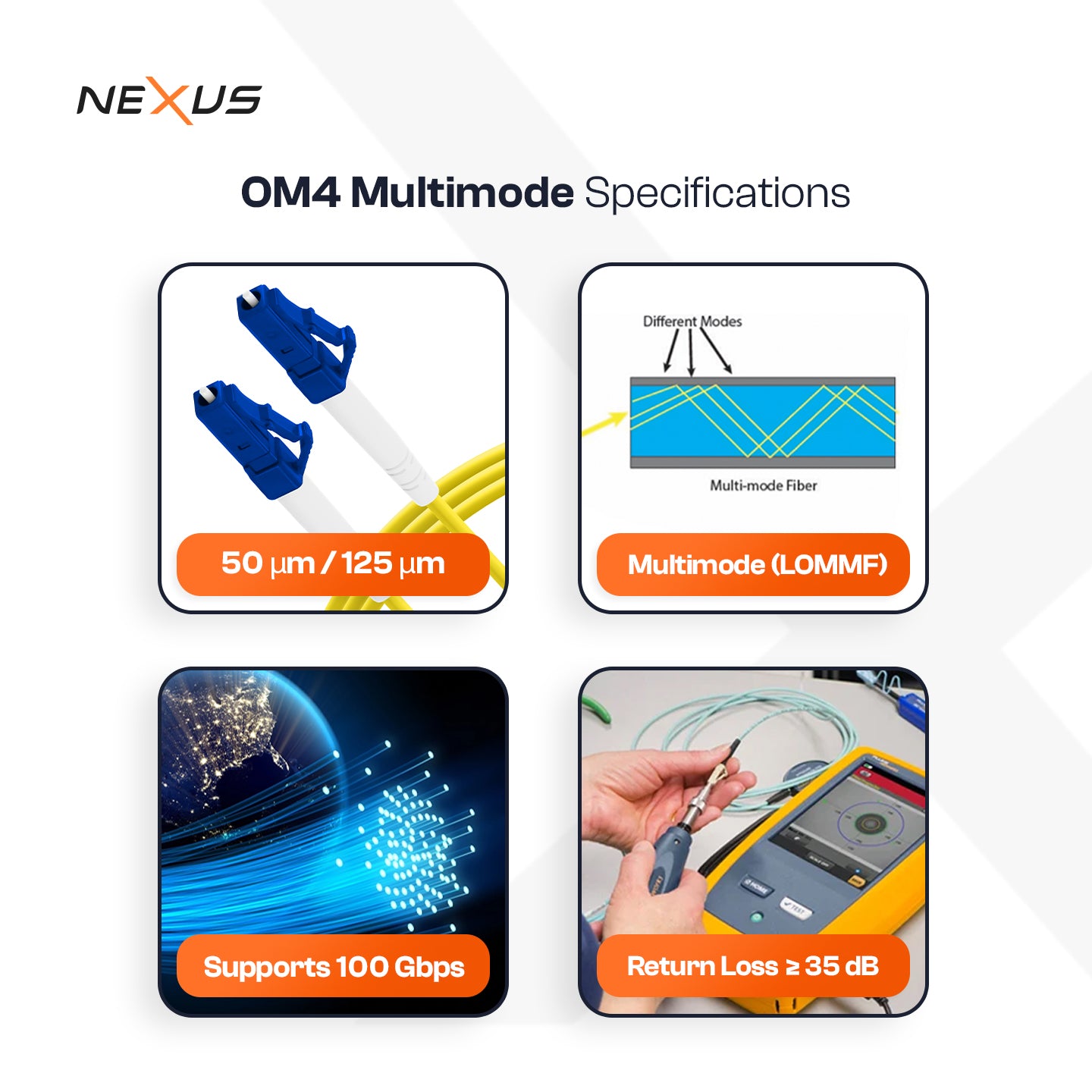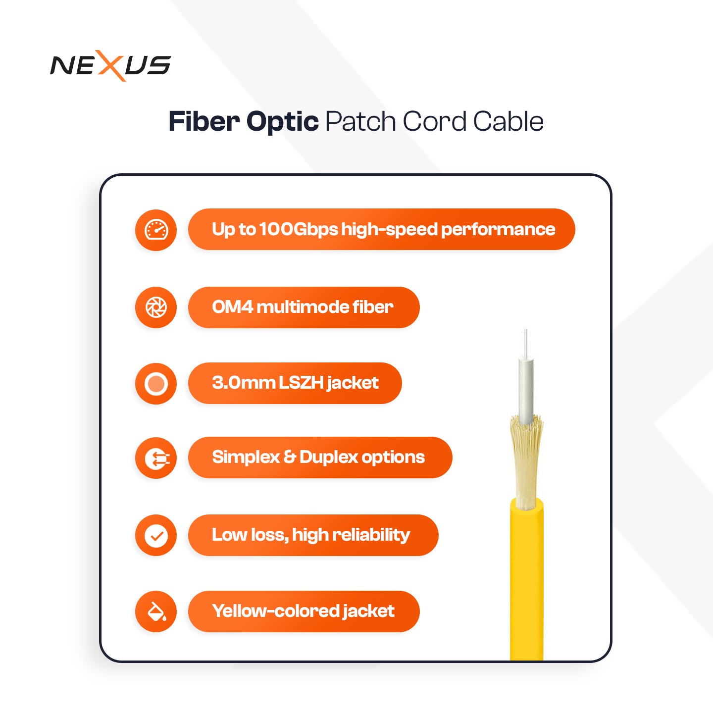 Built for modern high-bandwidth optical networks, the NEXUS OM4 duplex patch cord ensures reliable short-reach transmission in enterprise and data center infrastructures.